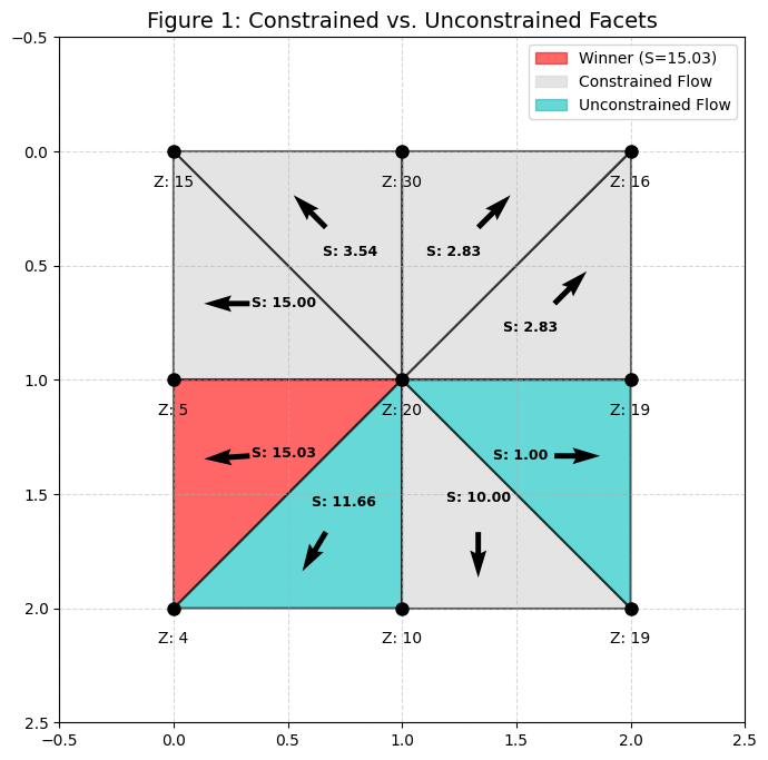 The Implication: This model is “deterministic” and computationally fast. However, it’s a poor representation of real-world physics. On a ridge or flat plain, it forces flow into the winner-takes-it-all cell, which does not model divergent flow (water fanning out). It’s best suited for steep, V-shaped valleys where flow is highly convergent. This algorithm tends to concentrate (overestimate) flow in gullies and underestimate the water availability on slopes.