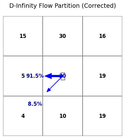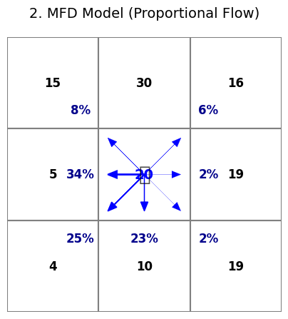 How it works: Instead of finding the single steepest cell, this algorithm looks at all neighboring cells that are lower than the center cell. It then partitions the flow among them. The amount of flow each neighbor receives is proportional to its gradient—the steeper the drop, the more flow it gets.