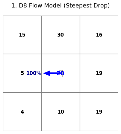 How it works: The algorithm looks at all 8 neighbouring cells and finds the one with the steepest gradient (steepest drop). It then assigns 100% of the flow from the centre cell to that single neighbour.